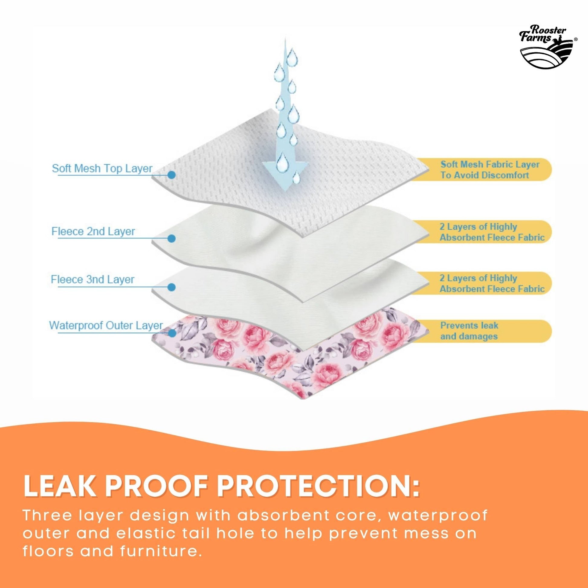 - Leak Proof Protection: Three layer design with absorbent core, waterproof outer and elastic body holes to help prevent mess on floors and furniture.